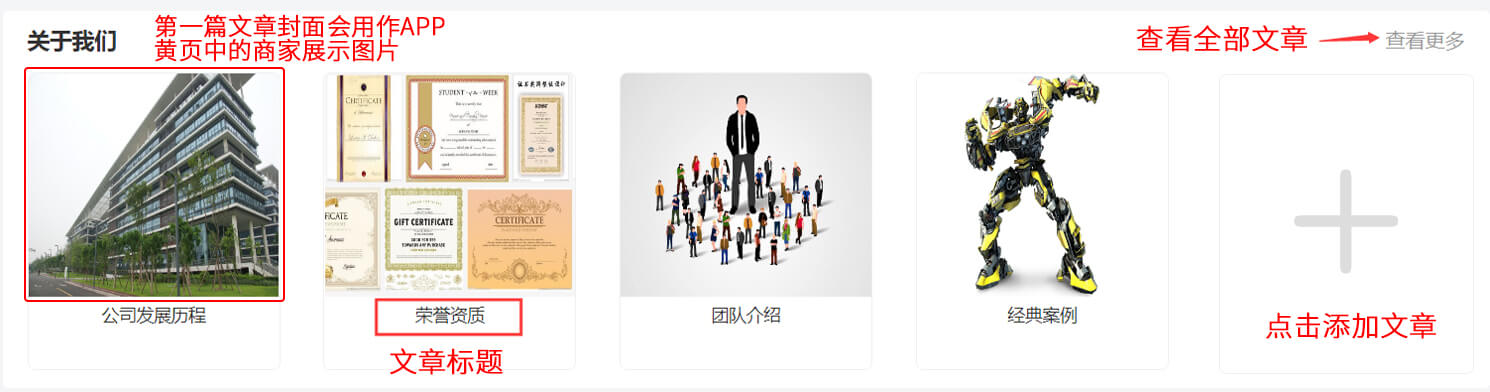 (2)点击“关于神彩争霸旧版下载”下方的加号即可发布文章。可填写简短重要标题,比如公司发展历程、荣誉资质、团队介绍、经典案例、商品展示等;建议至少上传一张精美图片,第一张图片会作为该篇文章封面,可在发布或编辑文章时拖动图片调整顺序。